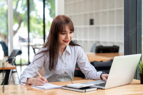 Young Asian businesswoman or student sitting on a laptop keyboard and taking notes at her desk.