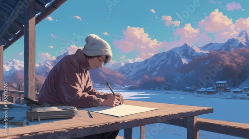 Young Asian male artist sketching by a serene winter lake at sunset.