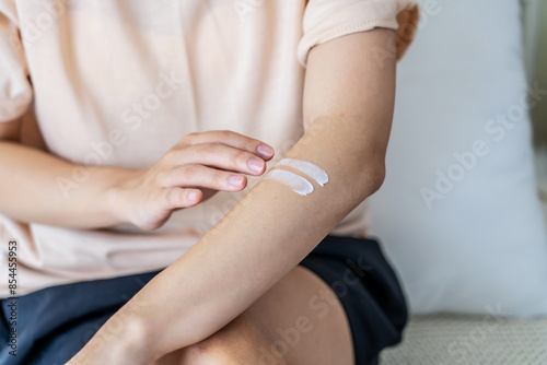 Young asian woman applying arm cream, lotion. Young Female do daily beauty body procedures or treatment. Hygiene and skin care concept, white cream rubbing to treatment skin condition, scrubbing