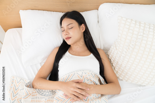 Young Asian woman sleeping on bed and keeping eyes closed while covered with blanket in bedroom. Asian woman sleep and lying on bed in bedroom in the morning. Healthcare concept