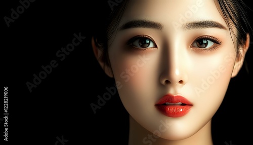 Young Asian woman with bright red lipstick and flawless skin against dark background, dramatic lighting highlights facial features and natural beauty makeup look.