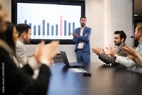 Young attractive businessman showing presentation to his colleagues