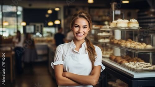 Young barista serving coffee. Grocery worker. Smiling beautiful woman in apron serving a big cup of coffee to a customer in a modern cafe, bar