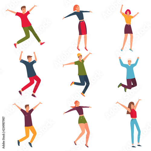 Young beautiful and free people in fashionable youth clothes jump and have fun with happiness.