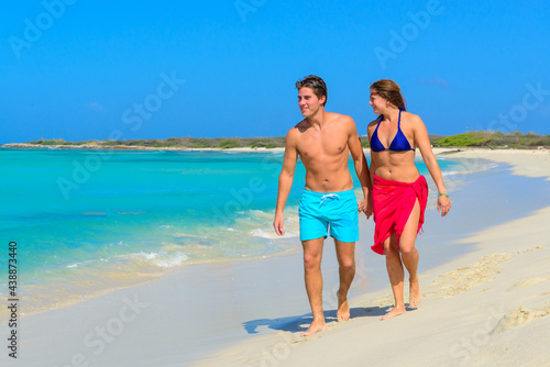 Young beautiful couple walking and relaxing on the beach