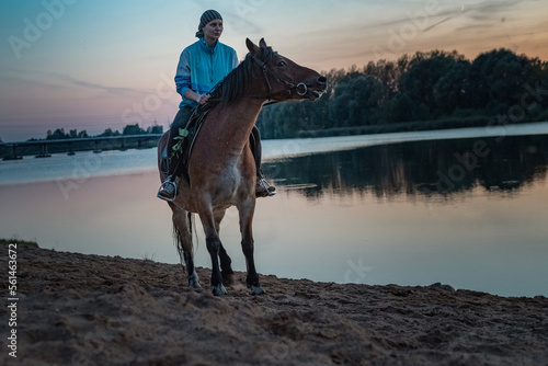 Young beautiful girl on a horse near the river in the evening.