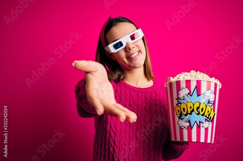 Young beautiful girl watching movie using 3d glasses eating box with popcorns smiling cheerful offering palm hand giving assistance and acceptance.
