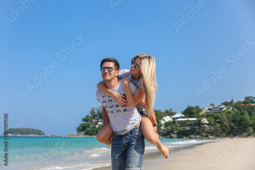 Young beautiful happy couple having fun on the beach. Piggyback rides. Positive human emotions, feelings. Love story