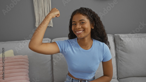 Young, beautiful, hispanic, woman, smiling and flexing muscle confidently in a cozy living room setting