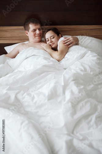 Young beautiful husband and wife resting in bed under a white blanket in a hotel room