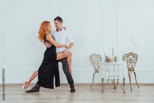 Young beautiful woman in a black dress and a man in white shirt dancing.