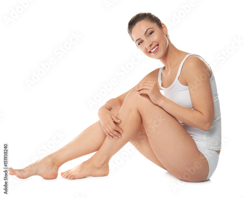 Young beautiful woman sitting on white background