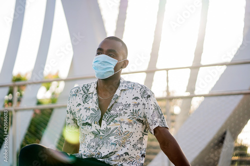 Young Black Man With Respirator Sitting Outdoors.