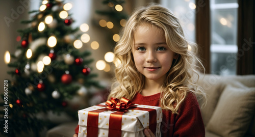 Young blond girl holds a gift in her hand at Christmas at her home
