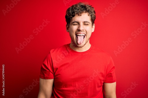 Young blond handsome man with curly hair wearing casual t-shirt over red background sticking tongue out happy with funny expression. Emotion concept.