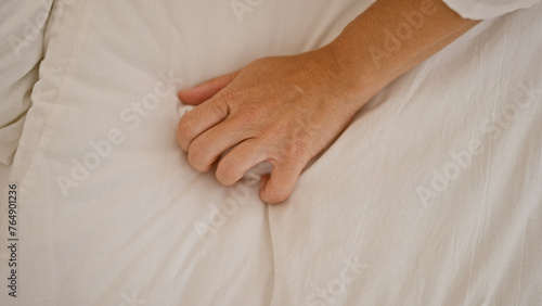 Young blonde woman having orgasm on bed at bedroom