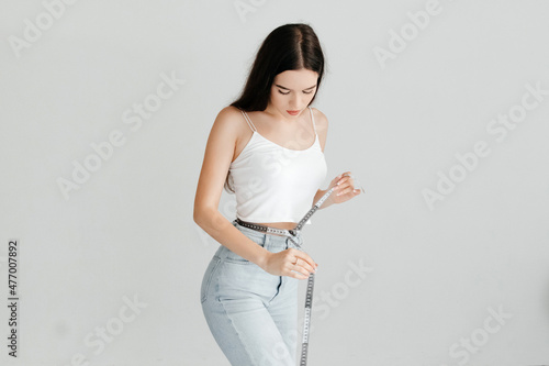 Young brunette woman measuring her waist, checking how many centimeters she lost. Beautiful woman measuring her perfect body