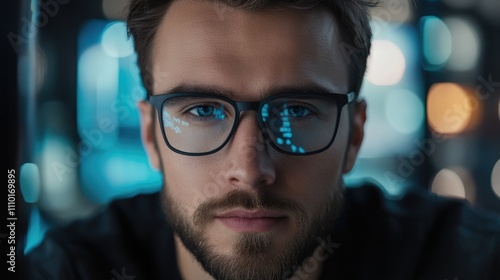 Young businessman interacting with futuristic technology and focusing on talent development in a digital workspace environment.
