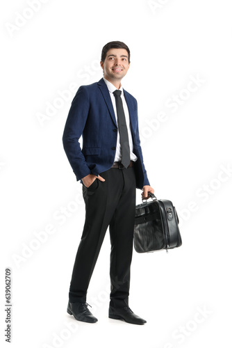 Young businessman with briefcase on white background