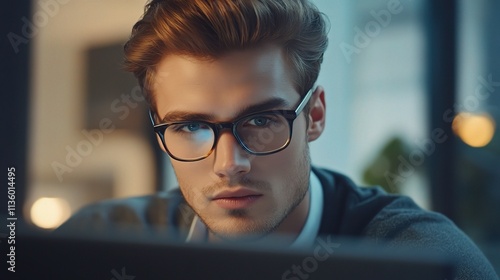 Young Businessman Working Focused and Attentive in Modern Workspace
