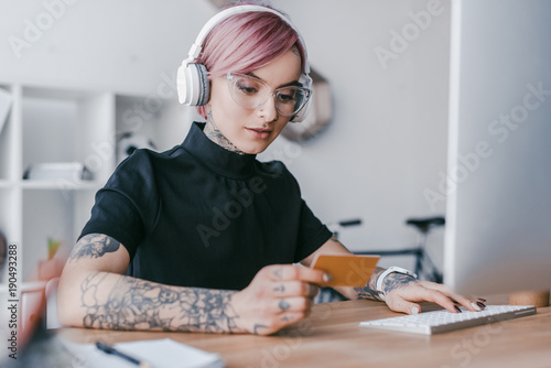 young businesswoman in headphones holding credit card and using desktop computer