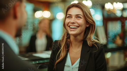 Young businesswoman laughing in a meeting, conveying positive workplace energy.