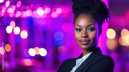 Young businesswoman radiates confidence in a sleek, neonlit office, creating a dynamic and inspiring work environment.