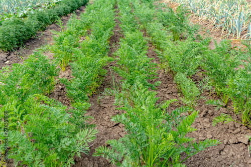 Young carrot plant sprouts grow on farm garden bed. Growing organic carrot crop - vegetables sprouts on farm field. Green carrot plant row growing.