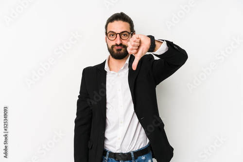 Young caucasian business man isolated on a white background showing a dislike gesture, thumbs down. Disagreement concept.