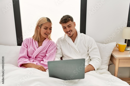 Young caucasian couple smiling happy using laptop sitting on the bed at home.
