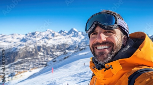 Young caucasian male enjoying a sunny day skiing in snowy mountain landscape.