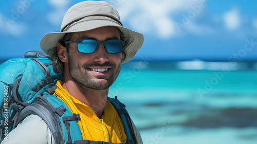 Young caucasian man exploring tropical beach with backpack and sunglasses