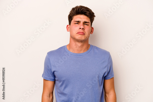 Young caucasian man isolated on white background sad, serious face, feeling miserable and displeased.