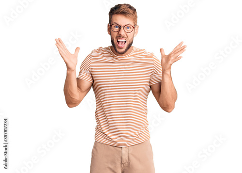Young caucasian man wearing casual clothes and glasses celebrating crazy and amazed for success with arms raised and open eyes screaming excited. winner concept