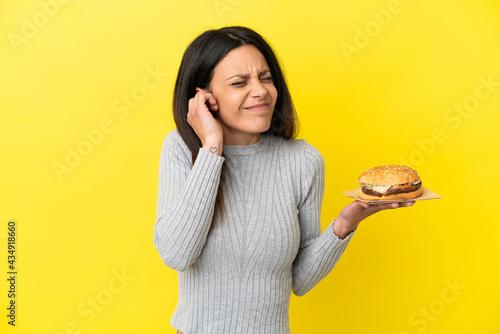 Young caucasian woman holding a burger isolated on yellow background frustrated and covering ears