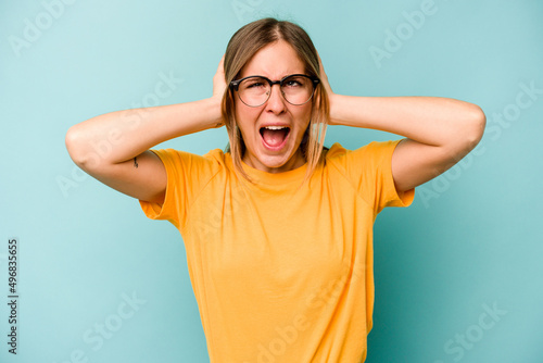 Young caucasian woman isolated on blue background covering ears with hands trying not to hear too loud sound.