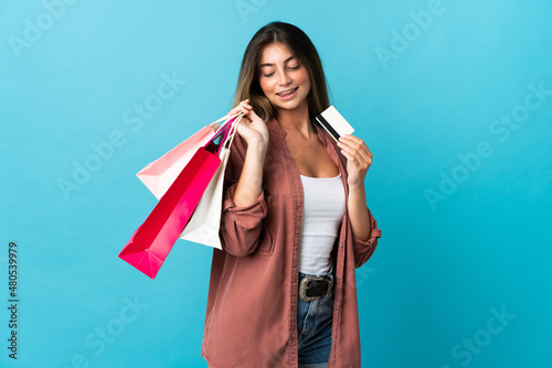 Young caucasian woman isolated on blue background holding shopping bags and a credit card