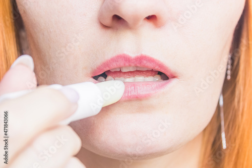 young caucasian woman with lip balm close up