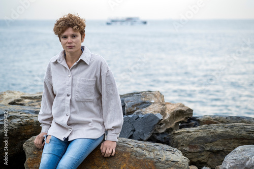 Young caucasian woman with short brown curly hair wearing beige corduroy shirt is sitting on a stone on the seashore at sunset, the sea is visible behind her back