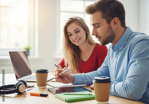 Young colleagues working together at desk with tablet and laptop, man writing with stylus while woman smiles, modern office teamwork with coffee cups and creative collaboration concept.