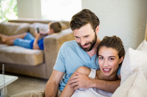 Young couple embracing on sofa