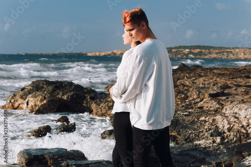 Young couple in love on the beach.Beautiful couple in white.Lovers holding hands and hugging