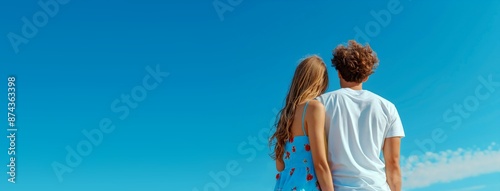 Young couple looking at vast blue summer sky from a low angle with copy space on the left