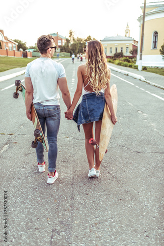 Young couple man woman walk summer city, background road view from rear. In hands skateboard, longboard. Holding hands, concept love, caring, understanding, relationship. Empathy care inspiration.