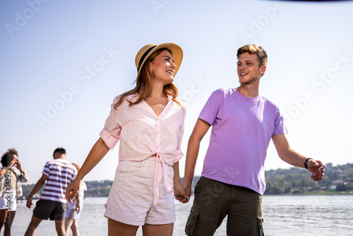 Young couple walking by the sea