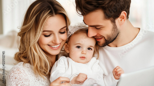 Young Couple with Child Dressed in White in a Cozy Room, Using Smartphone, Highlighting Sharenting Problem, Modern Parenting, Creating and Sharing Moments on Social Media.