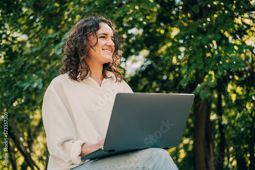Young curly woman is sitting outdoors with an opened laptop on her knees in summer.