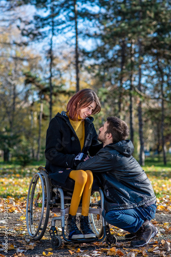Young disabled woman in a wheelchair with boyfriend. Man with disabled girl in a wheelchair
