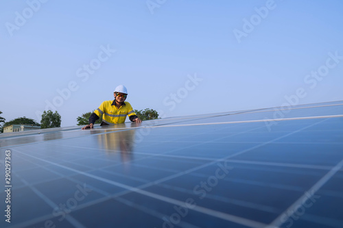 Young engineers who are expert in solar power generation systems, alternative electricity source, concept of sustainable resources