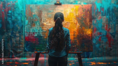 Young female artist with long hair standing in front of an abstract colorful canvas, creating vibrant artwork in a spacious studio with splattered paint backgroundartist